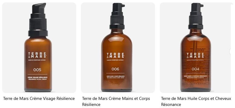 - Terre de Mars Crème Visage Résilience : crème visage nourrissante et repulpante, idéale pour peaux sensibles, qui hydrate en profondeur et protège la peau des agressions extérieures.